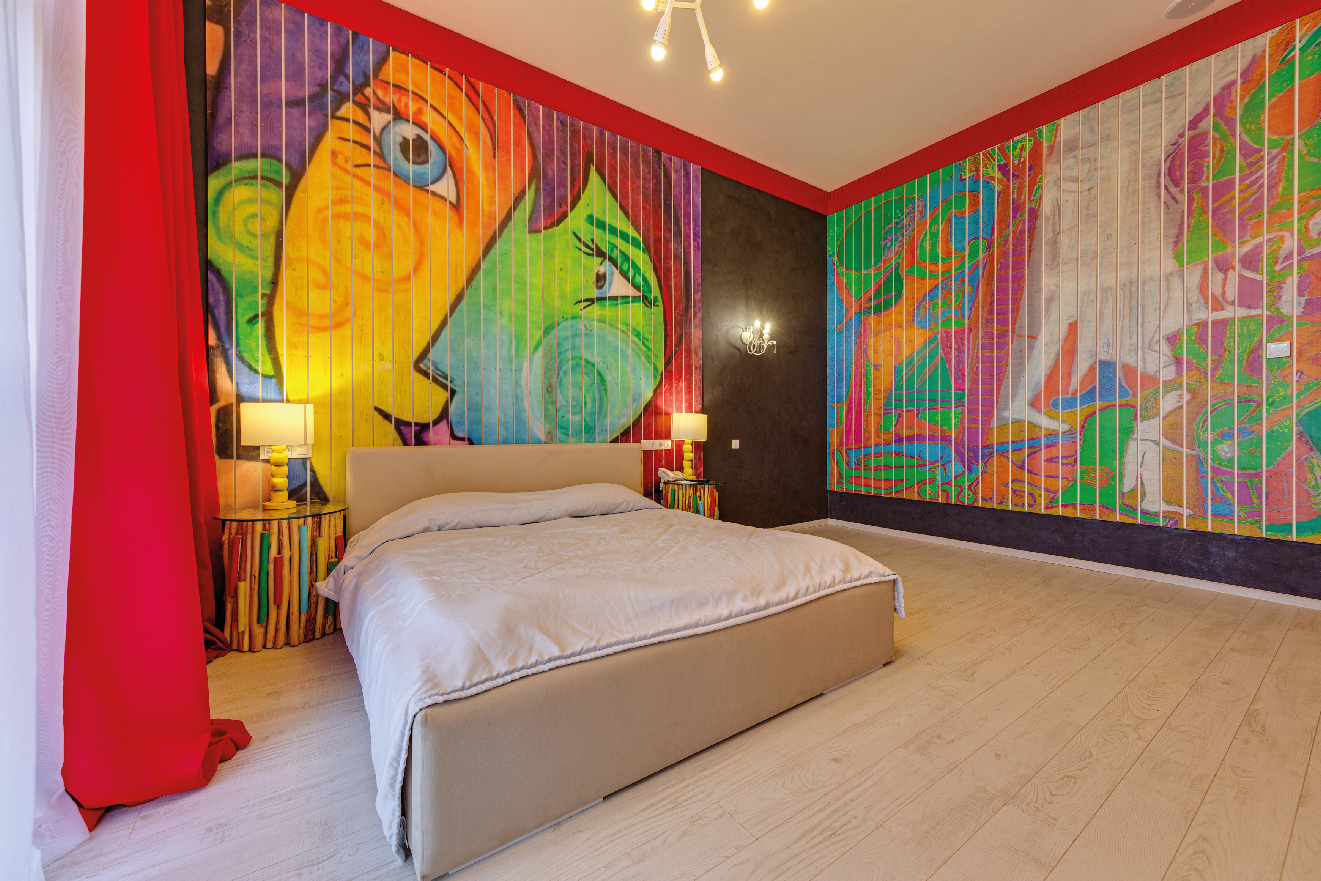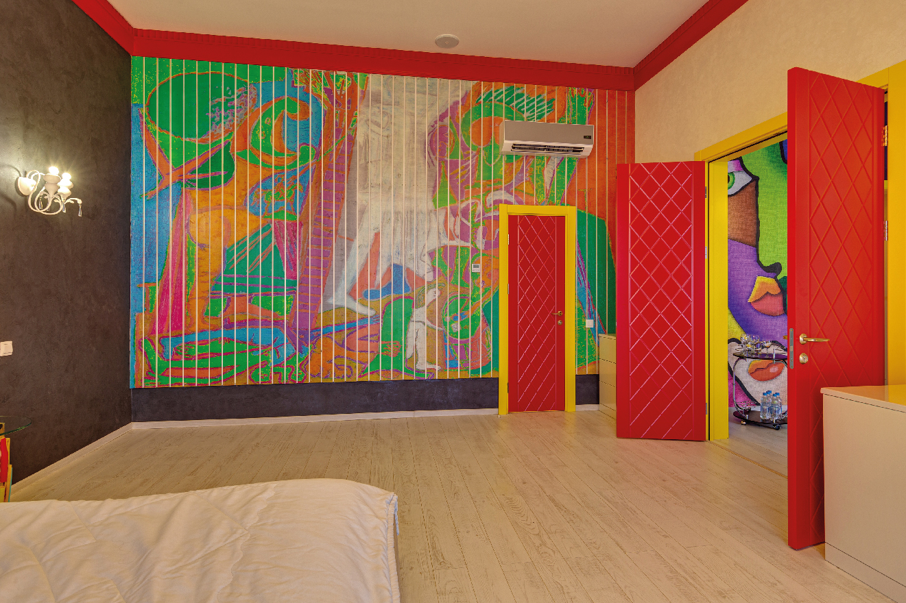 这是一间顶级“套房”类别的房间,灵感来自巴勃罗·毕加索的作品。通过使用大胆的颜色,如鲜艳的红色、耀眼的白色、深邃的黑色,以及明亮的黄色和绿色色调,实现了动感且富有表现力的室内设计。
