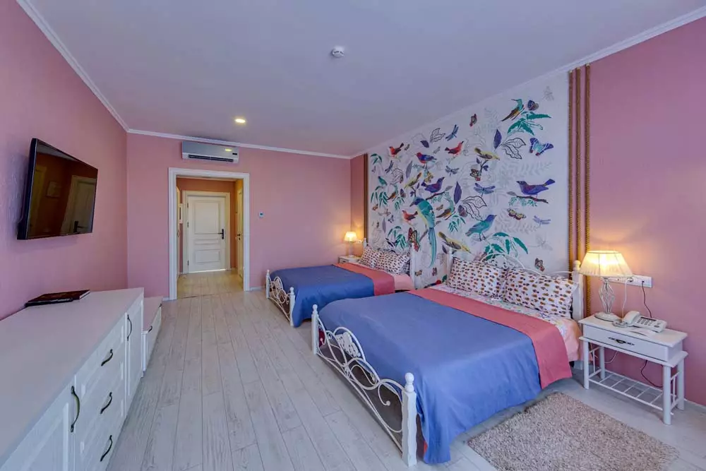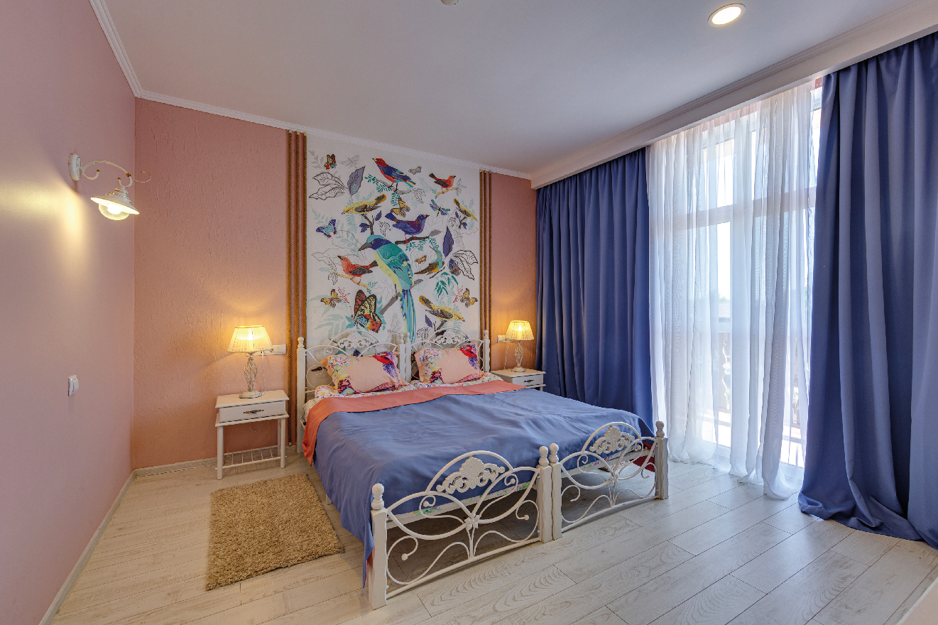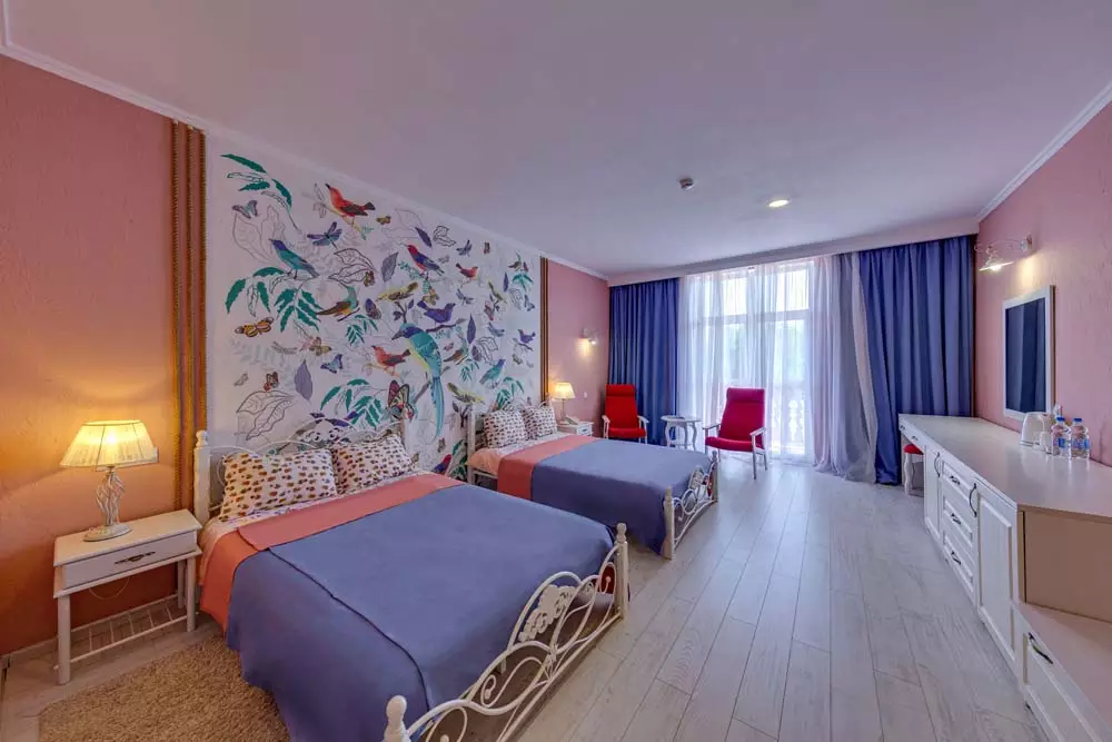 这是一间顶级“套房”类别的房间。明亮而令人难忘的设计将让每位客人都难以忘怀。房间的设计灵感来自罗梅罗·布里托的创作,这位艺术家在他的作品中融合了立体主义、波普艺术和涂鸦的元素。作为后现代主义的杰出代表,布里托的作品以其多样的文化影响而闻名。房间的内部装饰反映了这位艺术家的独特风格:鲜艳的色彩和独特的图案,展现了一种“充满希望与幸福的视觉语言,反映了艺术家对周围世界的乐观信念。”